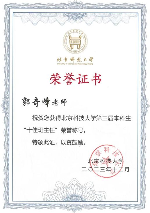 6. 北京科技大学第三届本科生十佳班主任,2023,北京科技大学,(郭奇峰)