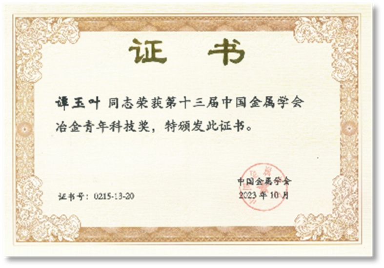 3.中国金属学会冶金青年科技奖,2023,中国金属学会,(谭玉叶)