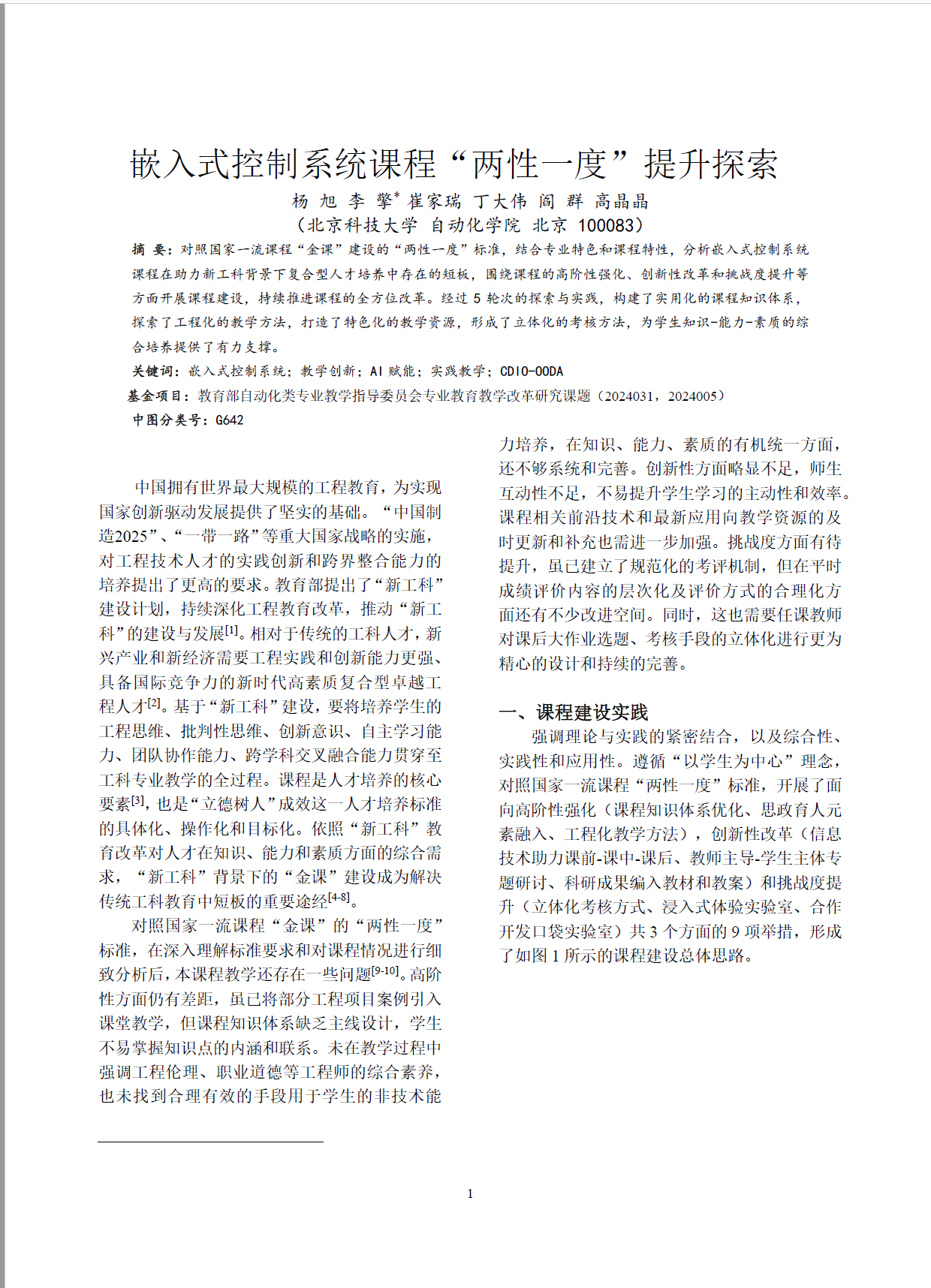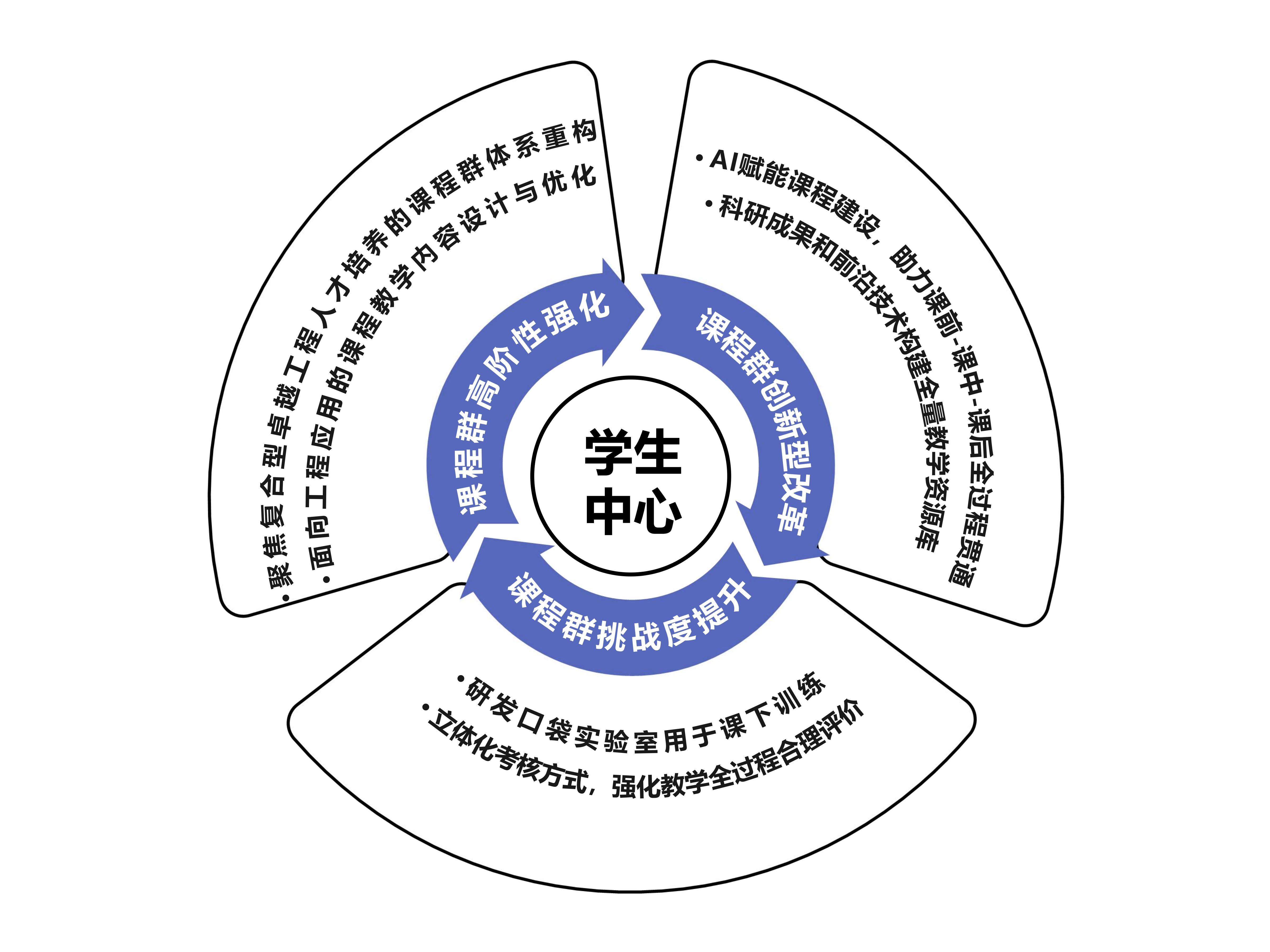 1)创建了聚焦复合型卓越人才培养的课程群体系,设计了面向工程应用的课程内容,应用了CDIO-OODA工程化教学方法,强化了课程群的高阶性。2)创建了融入科研成果和前沿技术的全量教学资源库,构建了AI赋能的云景互动教学管理平台,增强了课程群的创新性。3)自主研发了口袋实验室等实验设备,提出了层次化、多元化、多样化的考核方法,提升了课程群的挑战度。