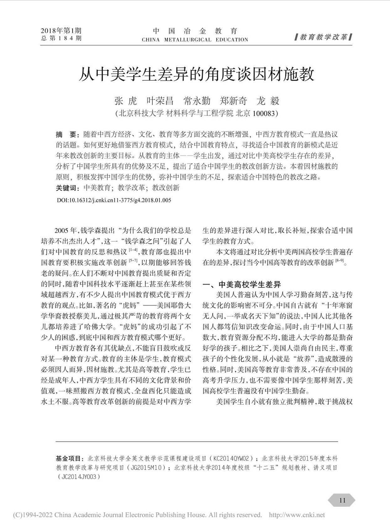 6 张虎, 叶荣昌, 常永勤, 等. 从中美学生差异的角度谈因材施教. 中国冶金教育, 2018, 1(184), 11-13.