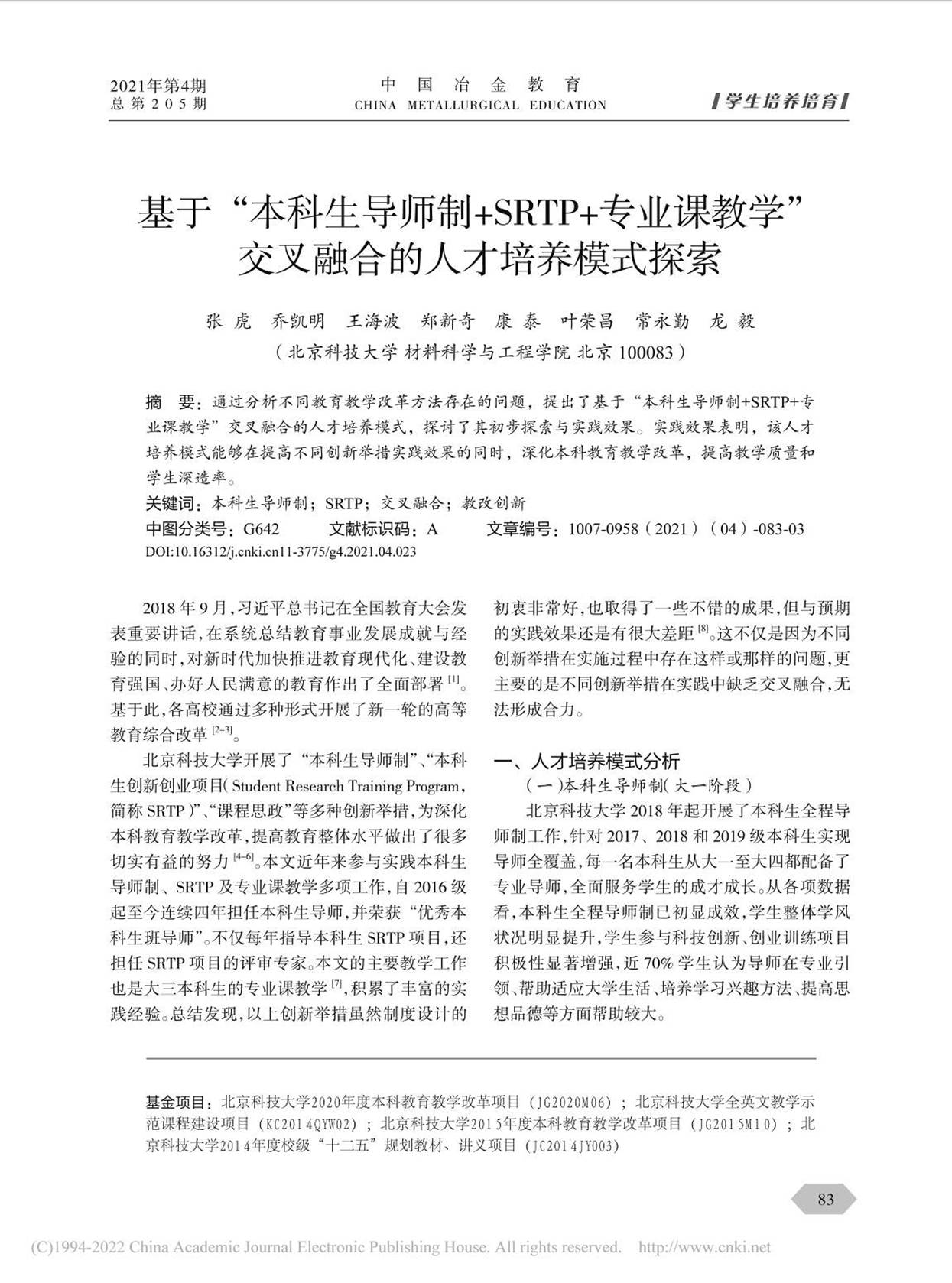 4 张虎, 乔凯明, 王海波, 等. 基于“本科生导师制+SRTP+专业课教学”交叉融合的人才培养模式探索. 中国冶金教育, 2021, 4(205), 83-85.