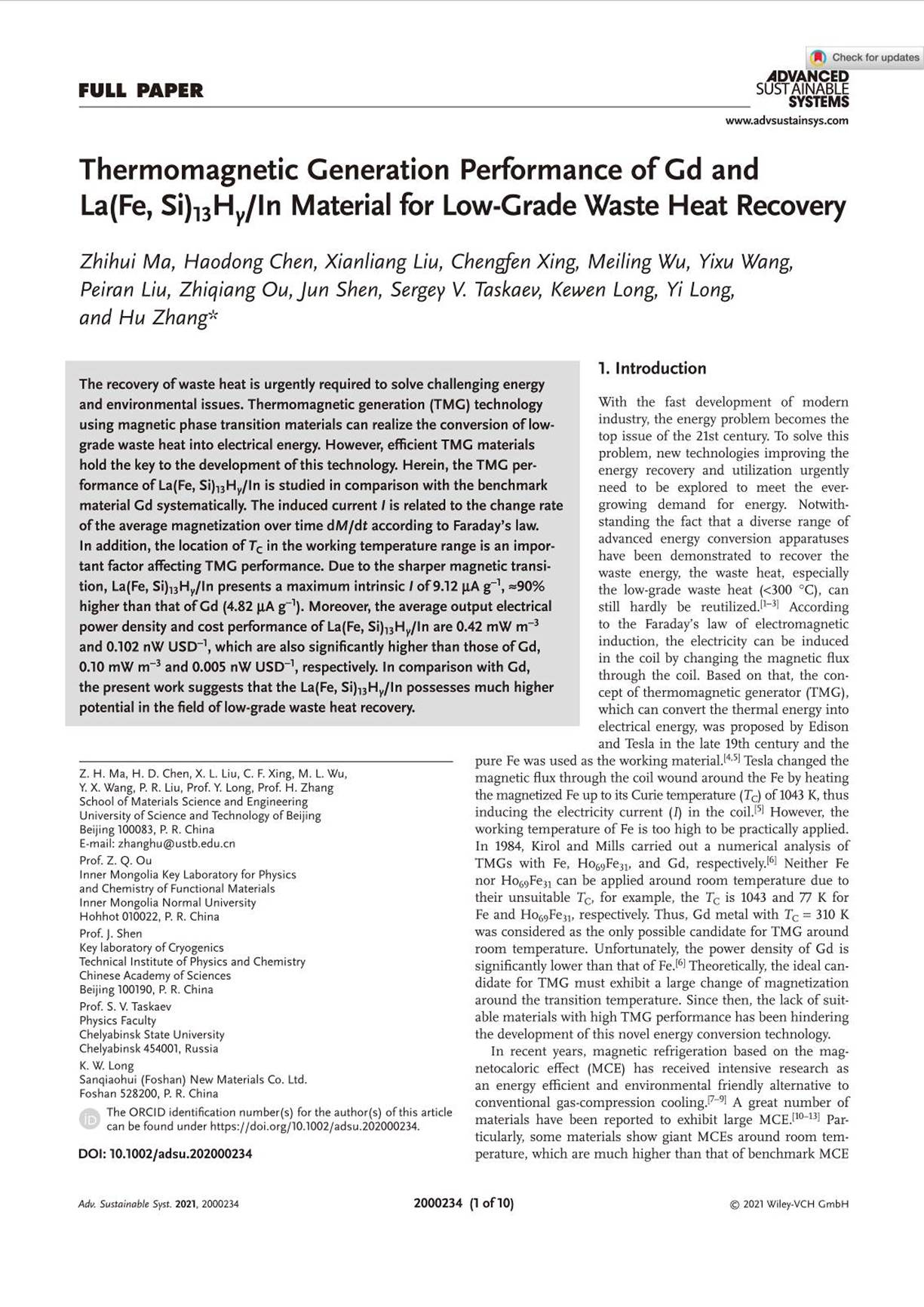 7 Zhihui Ma, Haodong Chen, Xianliang Liu, Chengfen Xing, Meiling Wu, Yixu Wang, Peiran Liu, Zhiqiang Ou, Jun Shen, Sergey. V. Taskaev, Kewen Long, Yi Long, and Hu Zhang*. Thermomagnetic generation performance of Gd and La(Fe, Si)13Hy/In material for low-grade waste heat recovery. Advanced Sustainable Systems 5, 2000234 (2021).