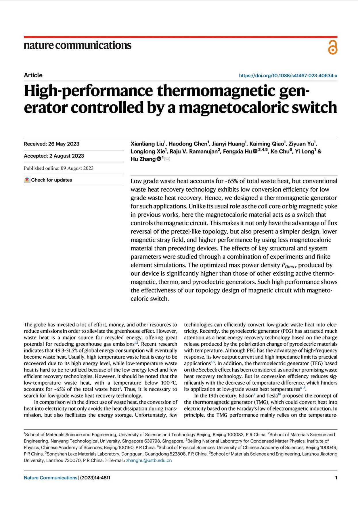 2 Xianliang Liu, Haodong Chen, Jianyi Huang, Kaiming Qiao, Ziyuan Yu, Longlong Xie, R. V. Ramanujan, Fengxia Hu, Ke Chu, Yi Long, and Hu Zhang*. High-performance thermomagnetic generator controlled by a magnetocaloric switch. Nature Communications 14, 4811 (2023).