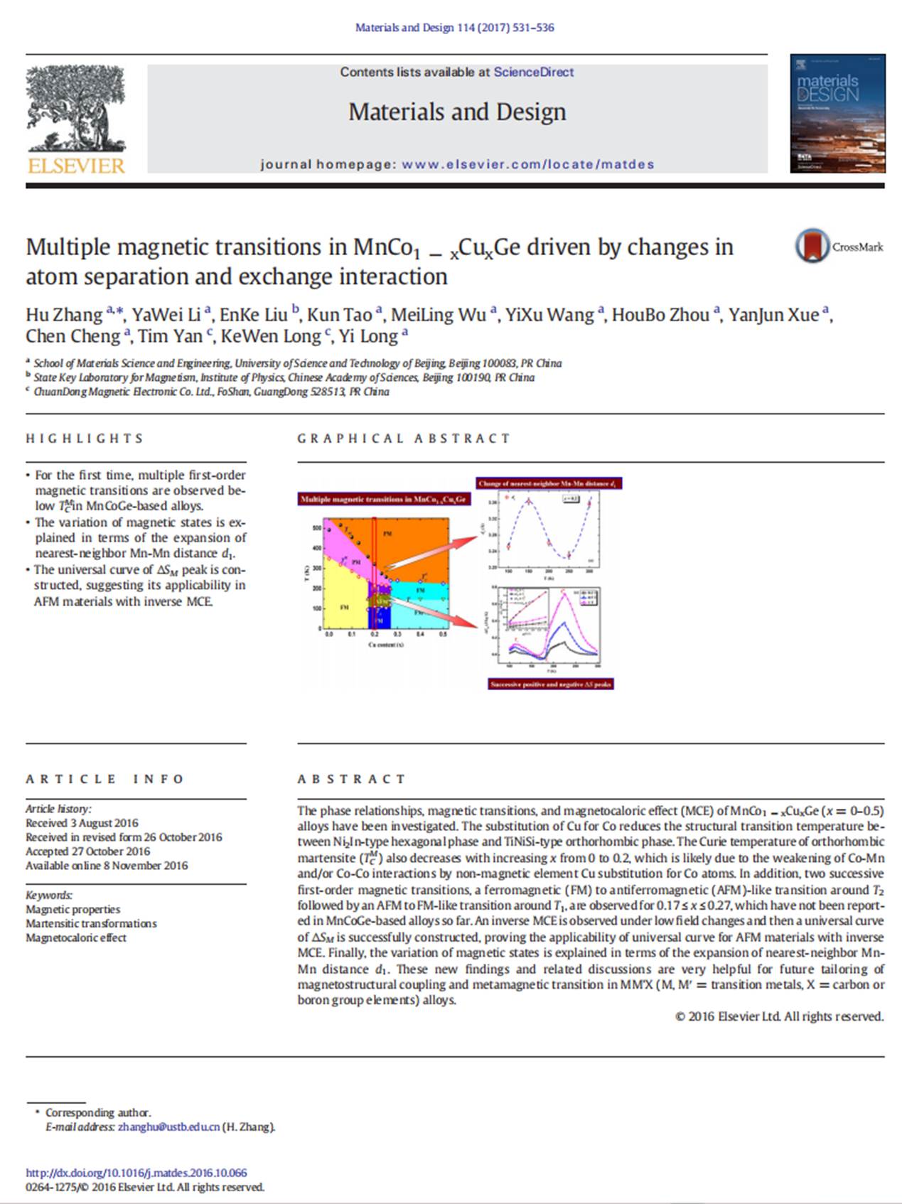 9 Hu Zhang*, Yawei Li, Enke Liu, Kun Tao, Meiling Wu, Yixu Wang, Houbo Zhou, Yanjun Xue, Chen Cheng, Tim Yan, Kewen Long, and Yi Long. Multiple magnetic transitions in MnCo1-xCuxGe driven by changes in atom separation and exchange interaction. Materials & Design 114, 531-536 (2017).