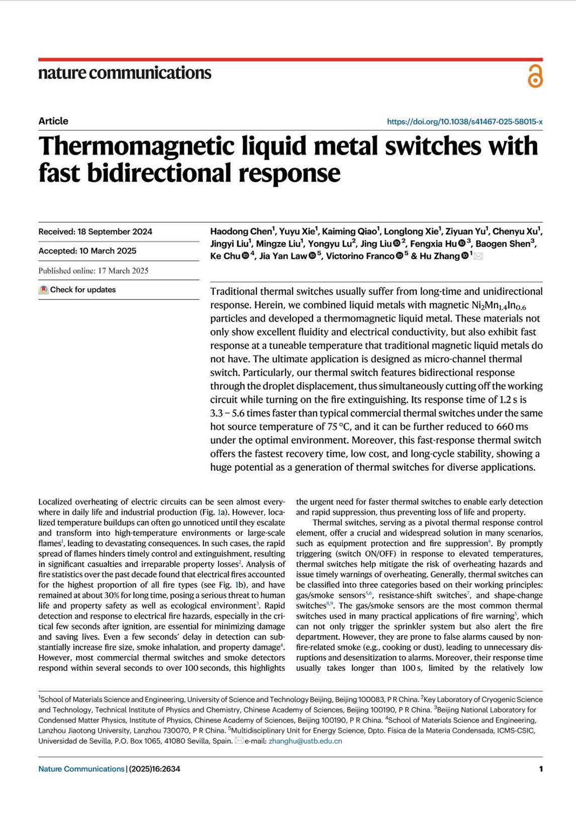 1 Haodong Chen, Yuyu Xie, Kaiming Qiao, Longlong Xie, Ziyuan Yu, Chenyu Xu, Jingyi Liu, Mingze Liu, Yongyu Lu, Jing Liu, Fengxia Hu, Baogen Shen, Ke Chu, Jia Yan Law, Victorino Franco, Hu Zhang*. Thermomagnetic liquid metal switches with fast bidirectional response. Nature Communications 16, 2634 (2025).