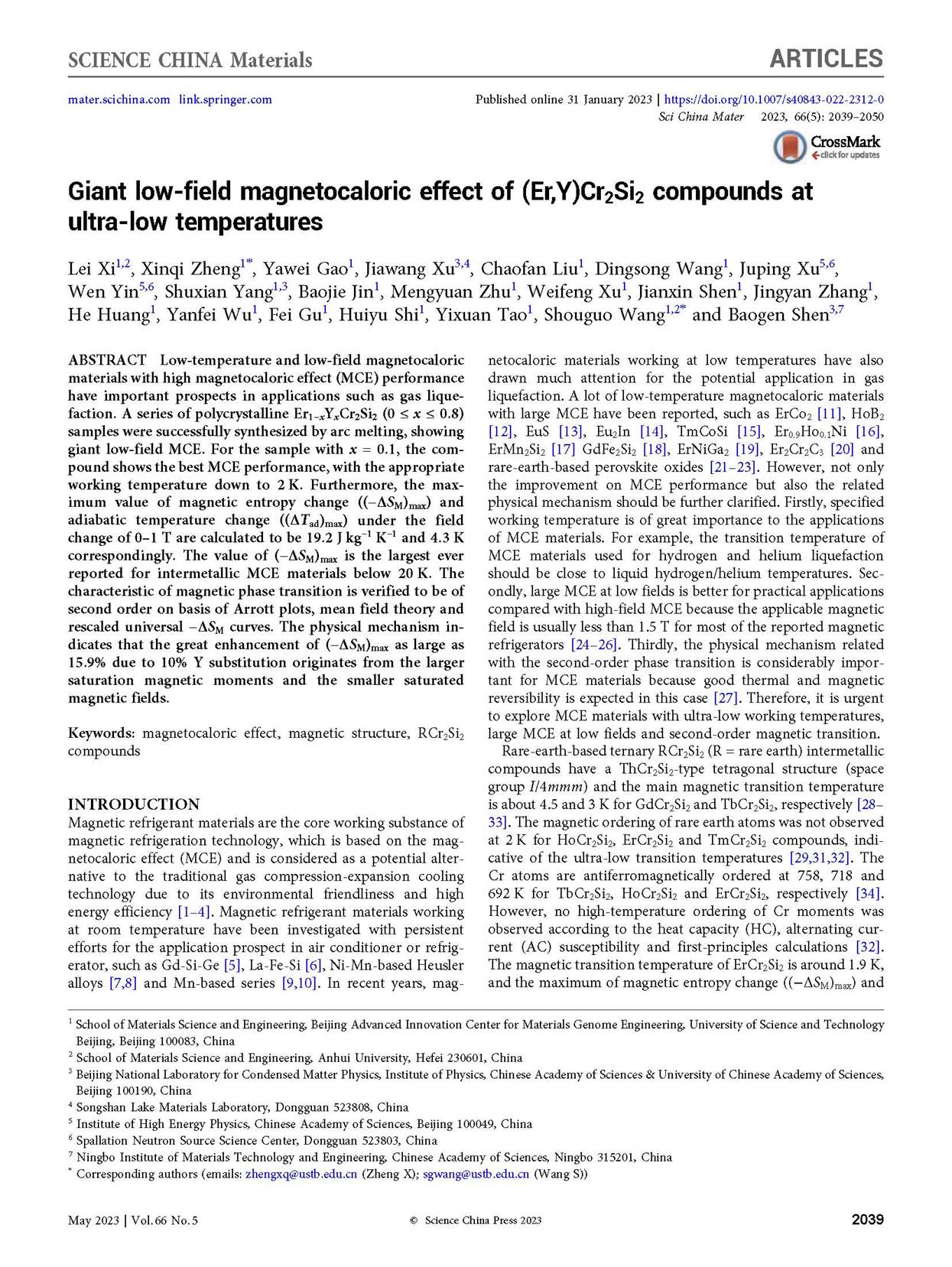 5 L. Xi, X. Q. Zheng*, Y. W. Gao, J. W. Xu, C. F. Liu, D. S. Wang, J. P. Xu, W. Yin, S. X. Yang, B. J. Jin, M. Y. Zhu, W. F. Xu, J. X. Shen, J. Y. Zhang, H. Huang, Y. F. Wu, F. Gu, H. Y. Shi, Y. X. Tao, S. G. Wang* and B. G. Shen, Giant low-field magnetocaloric effect of (Er,Y)Cr2Si2 compounds at ultra-low temperatures, Sci. China Mater. 2023, 66: 2039-2050