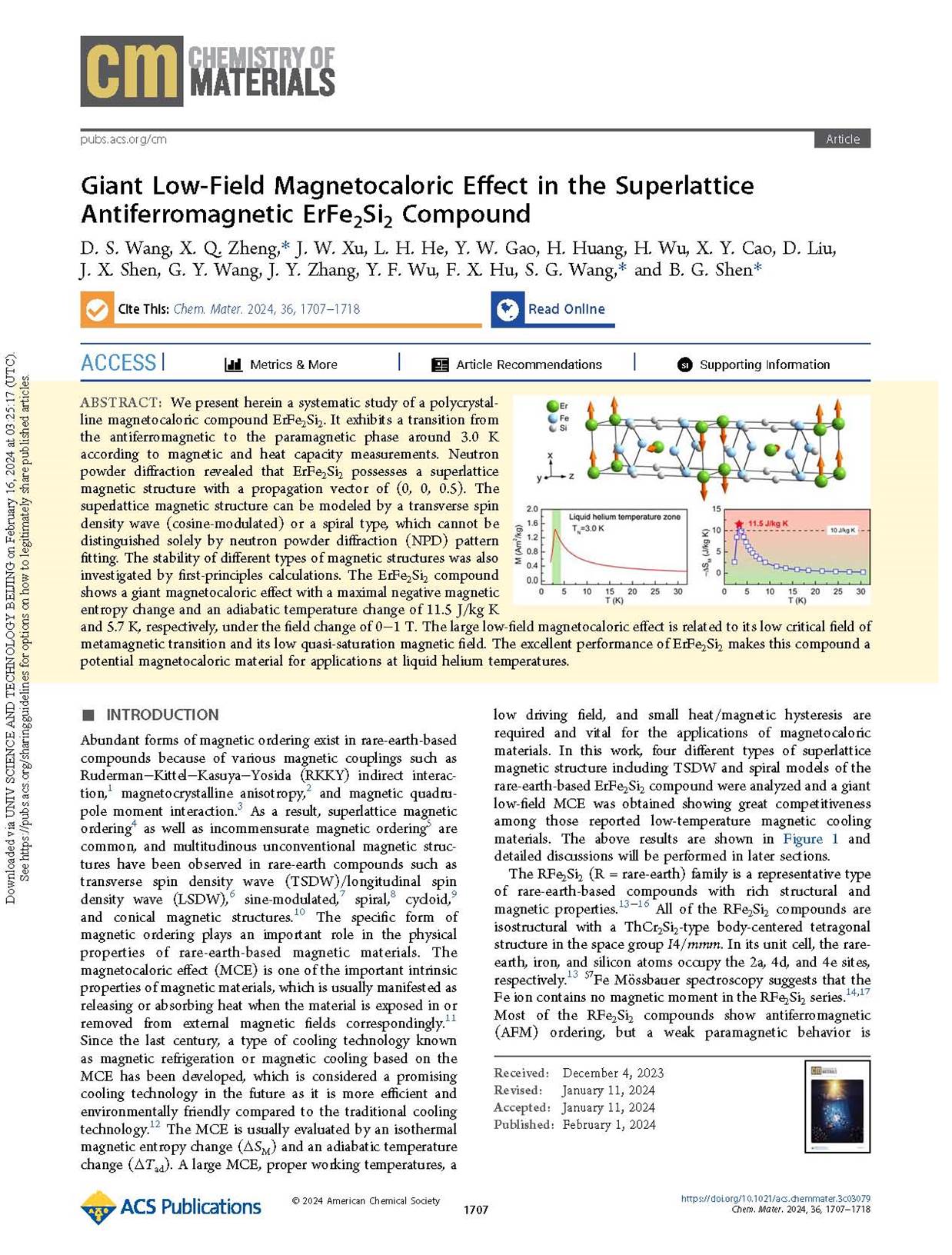4 D. S. Wang, X. Q. Zheng*, J. W. Xu, L. H. He, Y. W. Gao, H. Huang, H. Wu, X. Y. Cao, D. Liu, J. X. Shen, G. Y. Wang, J. Y. Zhang, Y. F. Wu, F. X. Hu, S. G. Wang* and B. G. Shen*, Giant low-field magnetocaloric effect in superlattice antiferromagnetic ErFe2Si2 compound, Chem. Mater. 2024, 36: 1707-1718