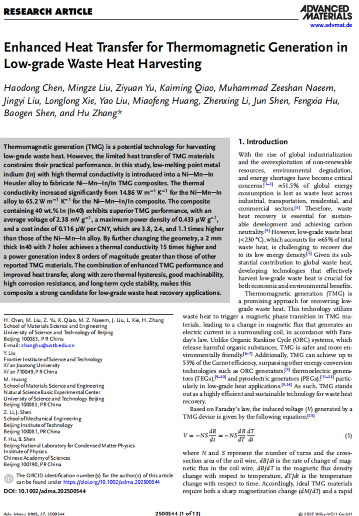 3 Haodong Chen, Mingze Liu, Ziyuan Yu, Kaiming Qiao, Muhammad Zeeshan Naeem, Jingyi Liu, Longlong Xie, Yao Liu, Miaofeng. Huang, Zhenxing Li, Jun Shen, Fengxia Hu, Baogen Shen, Hu Zhang*. Enhanced heat transfer for thermomagnetic generation in low-grade waste heat harvesting. Advanced Materials, 2500544 (2025).