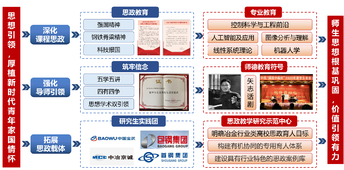 ①深化课程思政。深度挖掘控制学科与冶金行业蕴含的思政元素,将“钢铁脊梁”精神融入《控制科学与工程前沿》等核心课程,实现知识传授、能力培养与价值引领的有机统一,使专业教育与思政教育同向同行。②强化导师引领。落实每周理论学习制度,推行“五学五讲”模式,在学深悟透中筑牢信念,践行“为党育人、为国育才”初心使命;以孙一康教授为原型创作话剧《矢志》,塑造师德精神符号。③拓展思政载体。组建研究生实践团定期赴宝武、鞍钢等龙头企业开展科技服务与挂职锻炼活动;牵头建立冶金行业类高校课程思政教学研究示范中心,形成行业思政合力。