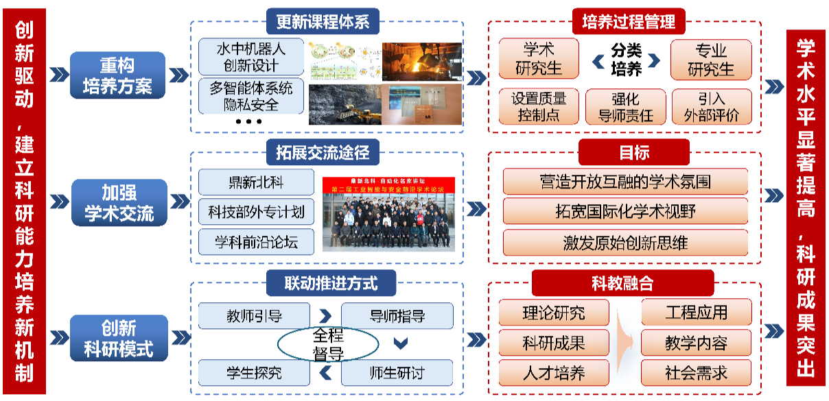 ①重构培养方案。新增《水中机器人创新设计》、《多智能体系统隐私安全》等前沿课程,构建多学科交叉的课程体系和分类培养方案。对标一流学科,重新制定毕业条件,严格执行学位论文质量管理制度。②加强学术交流。依托“鼎新北科-自动化”名家讲坛和科技部高端外国专家项目,主办“中国科学-信息科学前沿论坛”等高水平会议,营造开放包容的学术氛围,拓宽学生国际化视野。③创新科研模式。创建并实施“教师引导-导师指导-师生研讨-学生探究”联动推进方式,推动理论研究向工程应用转化、科研成果向教学内容转化、人才培养向社会需求转化,打通“学-研-用”闭环。