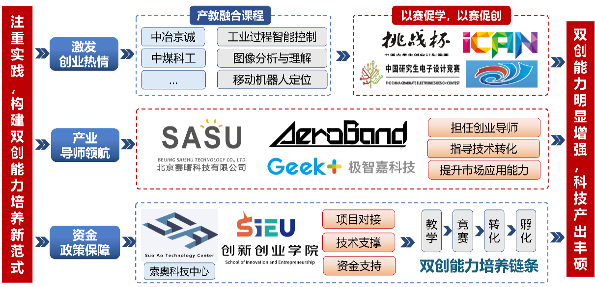 ①激发创业热情。与中冶京诚、中煤科工等企业联合开设《工业过程智能控制》、《图像分析与理解》等8门产教融合课程,将真实项目引入课堂;主办“亿智杯”人工智能创新大赛等系列竞赛,以赛促学、以赛促创。②产业导师领航。聘请企业技术专家担任创业导师,全程指导学生开展技术转化与项目孵化,提升解决复杂工程问题与市场应用能力。③资金政策保障。搭建索奥科技中心等创新创业平台,设立专项孵化基金,为成果落地提供项目对接、技术支撑与资金支持,形成“教学-竞赛-孵化-转化”一体化双创能力培养链条。