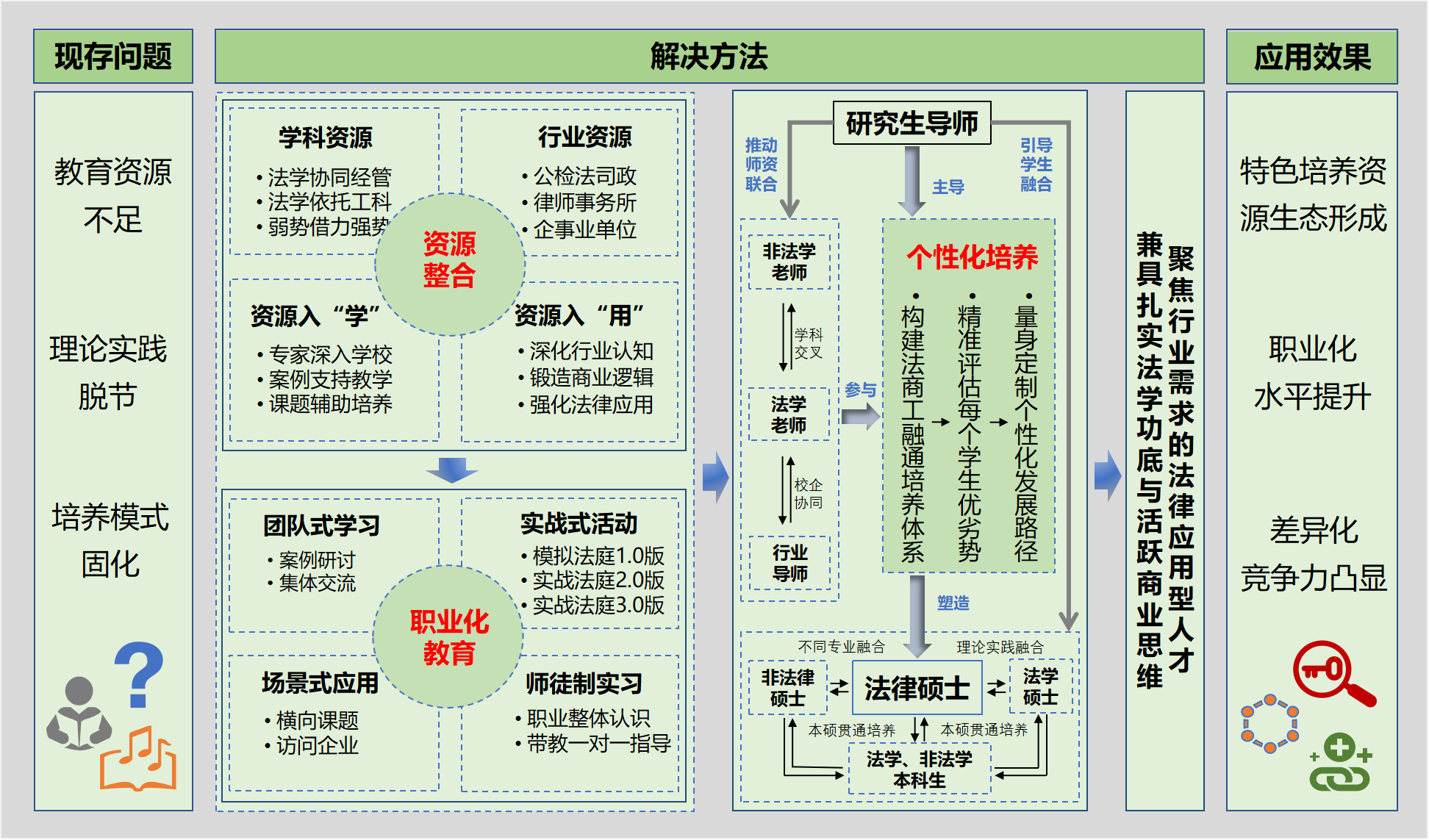 本成果依托工科强校的学科优势,确立“法商融合、扎根行业”的复合型人才培养目标,紧紧围绕着法律硕士培养的“素养+技能”软硬结合的职业化和服务国家产业发展的应用型特点,充分发挥研究生导师在专业硕士教育中“激发法律专业兴趣、传授系统学科方法、提供实践锻炼机会、培养法律职业情怀”四个作用,通过资源整合赋能各种职业化教育新形式,进行跨学科、学校、行业的师资联合和纵横交叉的学生融合,构建法商工融通培养体系,精准评估学生个人优劣势、量身定制个性化发展路径,最终培养出“法学基础扎实+行业认知精准+商科思维活跃”的法律应用型人才。成果由通过多名法律和管理学科的研究生导师经过多年探索和实践,推动各种资源融入法学教育各环节,借势学校和行业的优质资源跃升实现跨越式发展的合作范式,形成稳定的职业化教育基地,设计出创新的“多元交互”职业化教育形式,培养学生职业化程度较高,国家司法考试通过率显著高于平均水平,实习单位高度评价学生“具有出色的商科思维,个人核心竞争力、综合素质高于国内同期知名法学院学生”,显现出成果培养兼具扎实法律技能、开阔商业思维和准确行业认知的法律硕士的育人效果。