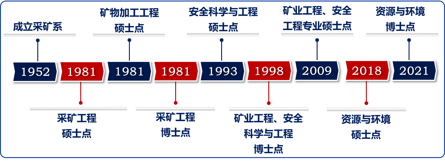 北京科技大学采矿工程为首批博士学位授权点学科,2009年起招收专业学位硕士,2021年获批“资源与环境”博士学位授权点学位点具有悠久的研究生培养历史和丰富的专业学位研究生培养经验(图1)。