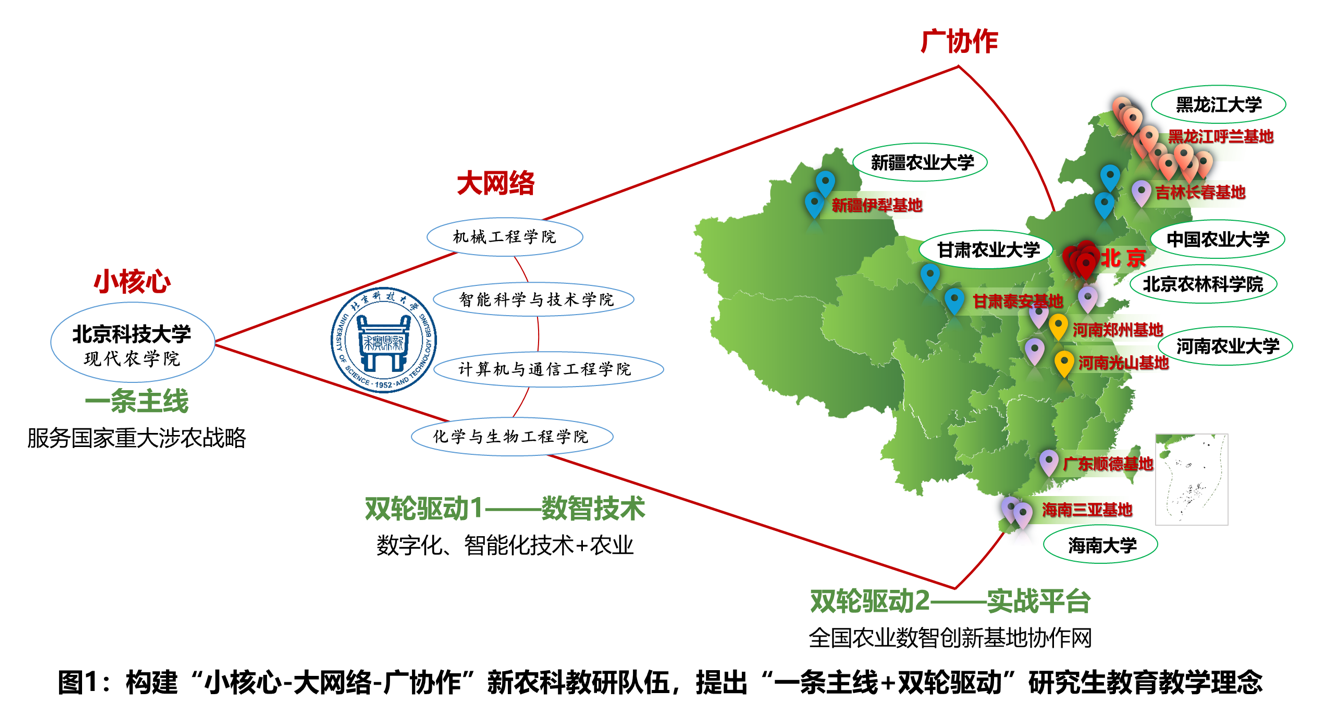 为此,北京科技大学(以下简称“北科大”)发挥传统工科优势,结合农业教研工作实践性与地域性强的特征,联合全国7家优势单位,构建了“小核心、大网络、广协作”的新农科教研队伍,以提高服务国家重大战略需求的能力为主线,成功开展了“数智技术+实战平台”双轮驱动的新农科研究生培养模式改革与创新(图1)。主要成果: