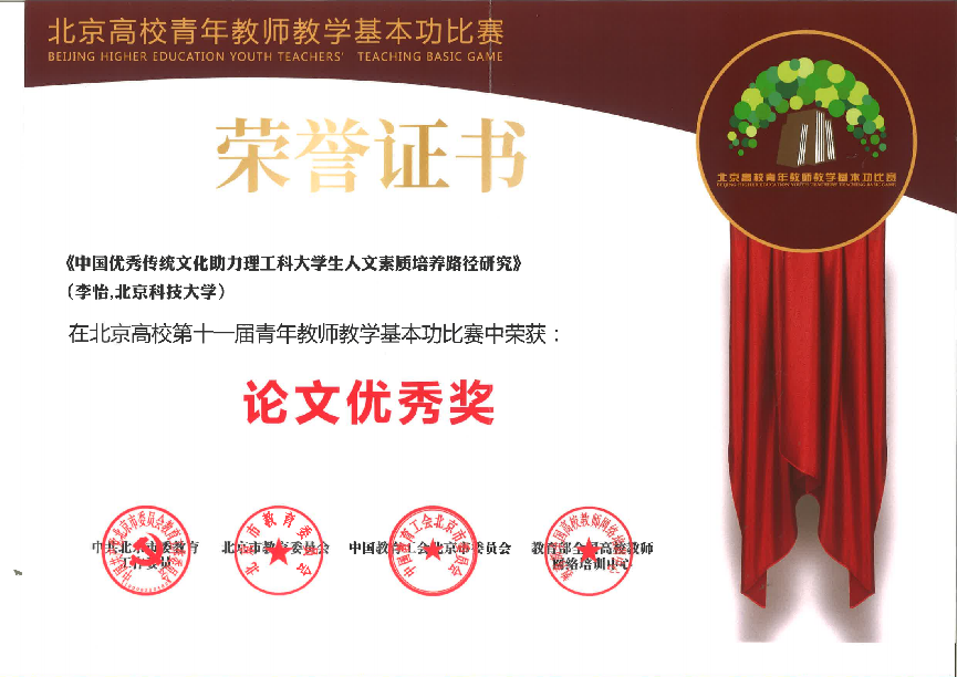 4.北京高校第十一届青年教师教学基本功比赛论文优秀奖,2019年11月,李怡