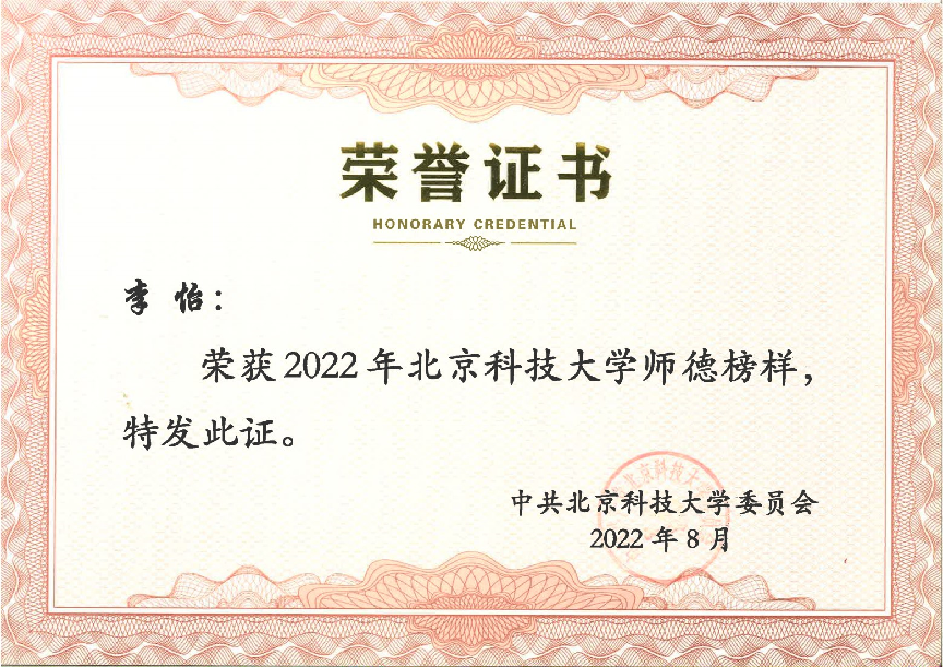 6.2022年北京科技大学师德榜样,2022年8月,李怡
