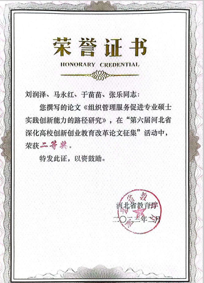1.第六届河北省深化高校创新创业教育改革论文征集二等奖,河北省教育厅,2023年2月,于苗苗