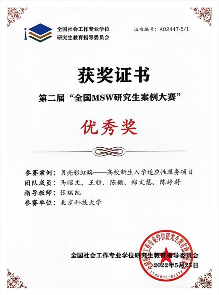 3.第二届全国MSW研究生案例大赛优秀奖,全国社会工作专业学位研究生教育指导委员会,2022年5月