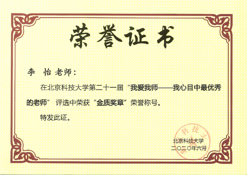 8.北京科技大学第二十一届“我爱我师——我心目中最优秀的教师”之“金质奖章”,2020年6月,李怡