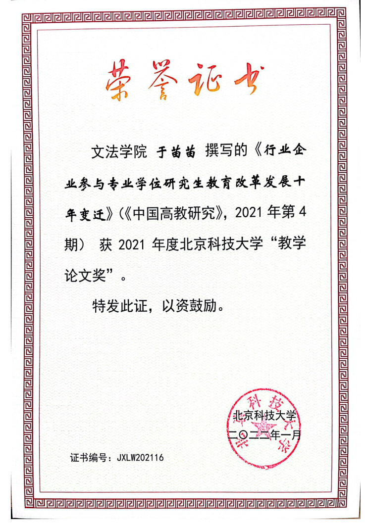 5.2021年度北京科技大学教学论文奖,北京科技大学,2022年1月,于苗苗