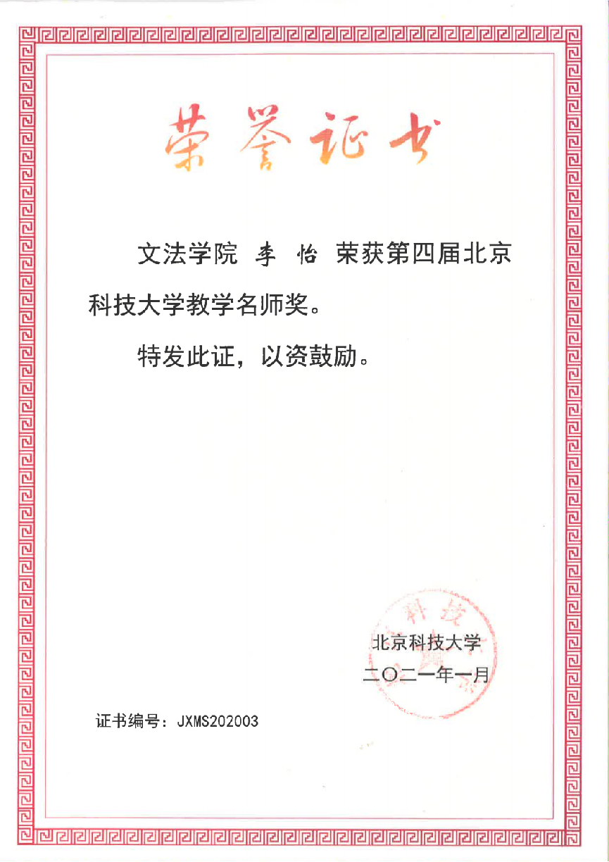 7.第四届北京科技大学教学名师奖,2021年1月,李怡