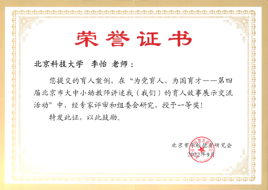 2.“为党育人、为国育才”——第四届北京大中小幼教师讲述我们的育人故事展示交流活动一等奖,2022年9月,李怡