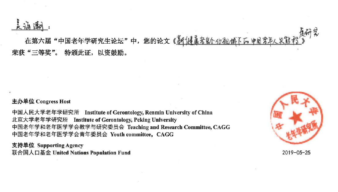 4.第六届“中国老年学研究生论坛”三等奖,中国人民大学老年学研究院,2019年5月