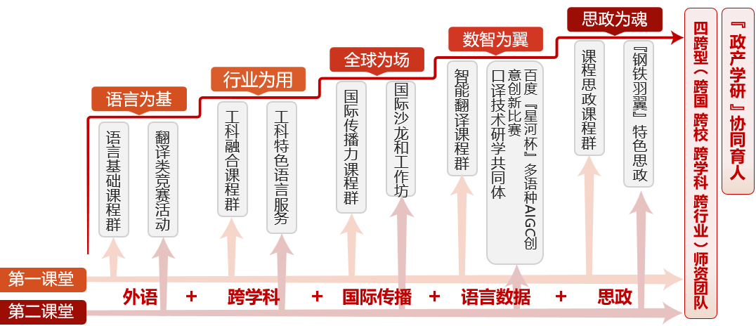 对接国家发展战略,主动服务学校优势学科,将数智思维融入行业智能语言服务人才培养全流程: