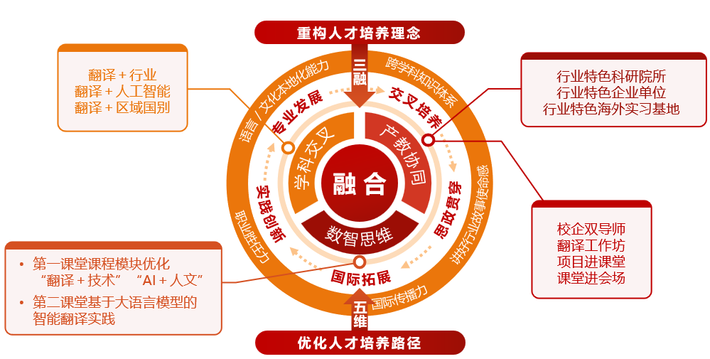 以“需求导向、特色发展”为指导理念,以“行业语言解决方案提供者”为培养定位,“三融”筑基、“五维”破局。