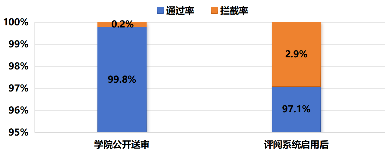 创建了专家匹配精准、评价权威公允、进度实时可控的自有论文评阅管理信息系统。高效服务硕士生学位论文评审需要,实现硕士匿名盲审90%覆盖率。校内匿名评审系统送审的硕士论文平均评阅周期为1周,显著低于第三方平台3~4周的评阅周期。公开送审学院论文初评拦截率0.2%,实施盲评的培养单位论文初评拦截率2.9%,盲评系统的把关效果明显;根据对近几年上级教育行政管理部门对硕士学位论文抽检结果的统计,当年参加盲评单位论文全部合格;部分单位在利用学校自有系统开展博士论文预盲评后,学位中心论文正式评阅通过率显著上升。