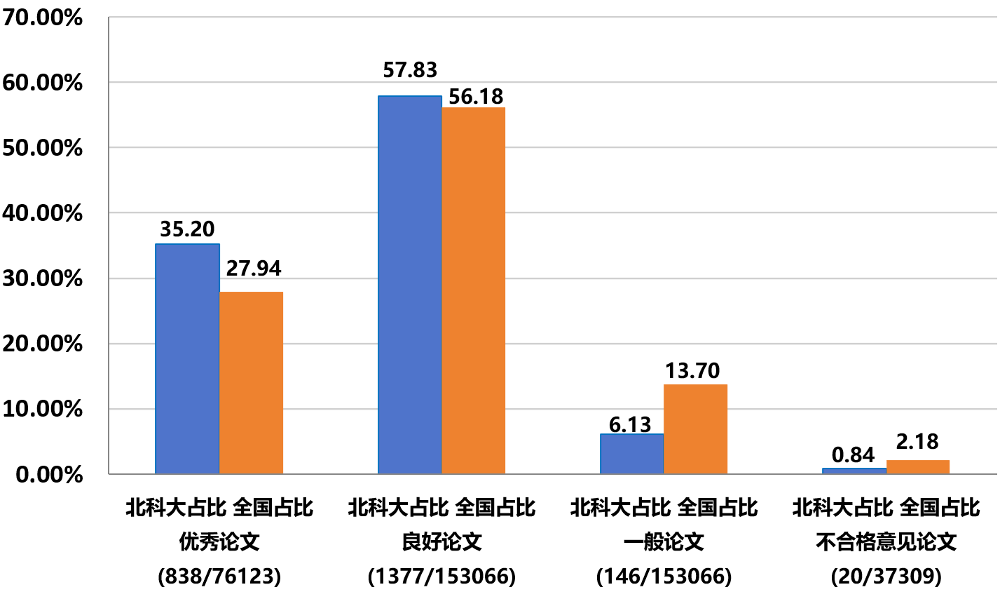 优秀研究生教育教学成果数量逐年提升,自北京市2022年开展优秀博士学位论文评选3年来,我校共计9名博士生获得优秀及提名优秀学位论文,2名教师获得北京市优秀研究生指导教师;每年有近30名研究生获全国一级学会优秀学位论文,较2018年增长5倍。博士论文整体质量持续提升,根据教育部学位中心统计结果,近年来我校博士学位论文匿名评审通过率始终保持在全国高校前列,其中优秀论文占比超过35%。