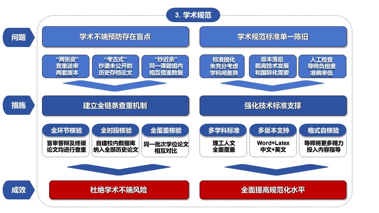 (3)强化技术标准支撑,主动提高规范水平 创立多维模板体系。围绕不同研究生群体论文撰写需要,分类开发“工、理、文”多学科、“中文+英文”双语、“Word+LaTeX”双版本论文模板,形成特色鲜明的模板体系。开展论文格式自检。搭建学位论文格式检测系统,提前发现格式错误,导师聚焦内容核心,提升指导效率。杜绝学术不端行为。整合盲审和查重渠道,对盲审、答辩直至授学位后公开的所有论文进行重复率检查,消除版本差异风险;设立校内查重数据库,将同批次其他学生论文及未获公开授权的存档论文纳入查重范围。