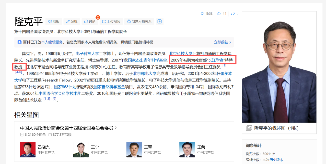 截至目前“长江学者特聘教授” 2人