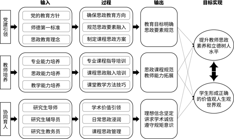第一,师资队伍是课程思政主力军,通过强化“政治引领、思想引领、榜样引领和精神引领”“引领机制”解决教师政治思想素养和师德师风建设不断提高的诉求。第二,通过“思政要素一体化机制”研究形成十个维度28个学科思政要素,确保不偏航。第三,通过教学委员会统一思政融入专业课程方法,老教师“一带一”示范,青教赛以赛促教等,用“专家指导+方法统一+示范观摩”“三维赋能”机制解决教育教学方法和思政融入要求。第四,通过制度化设计强化导师、辅导员和教务员“协同机制”责任联动,提升思政育人效果。