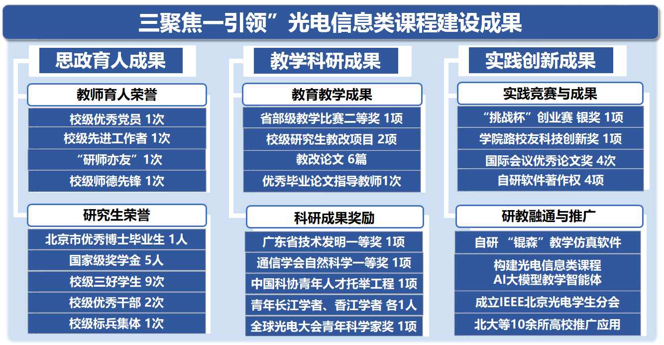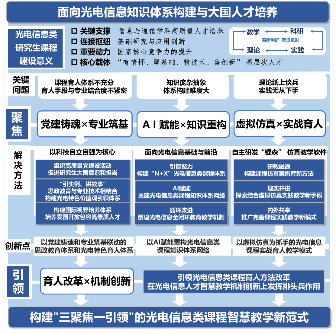 本成果立足于光电信息类课程建设,以培养 “有情怀、厚基础、精技术、善创新” 的研究生为目标,着力解决三个方面的关键性问题: